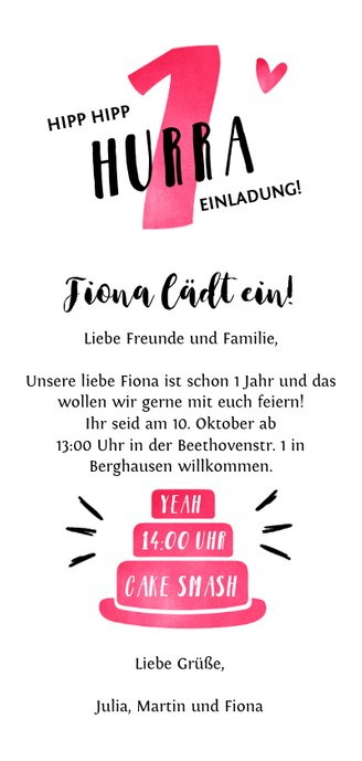 Einladung Zum 1 Geburtstag Mit Pinker Torte Kaartje2go